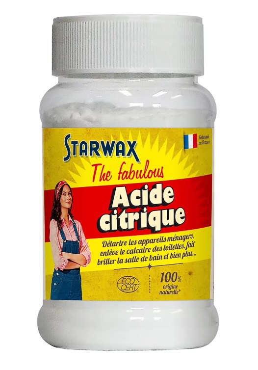 - Produit recommandé : Acide citrique monohydraté en poudre (souvent vendu comme produit ménager ou alimentaire - E330). N’importe quelle marque reconnue de droguerie ou de produits écologiques (comme Le Briochin, La Droguerie Écologique, ou les marques de distributeur) fera l’affaire, à condition qu’il s’agisse d’acide citrique pur.