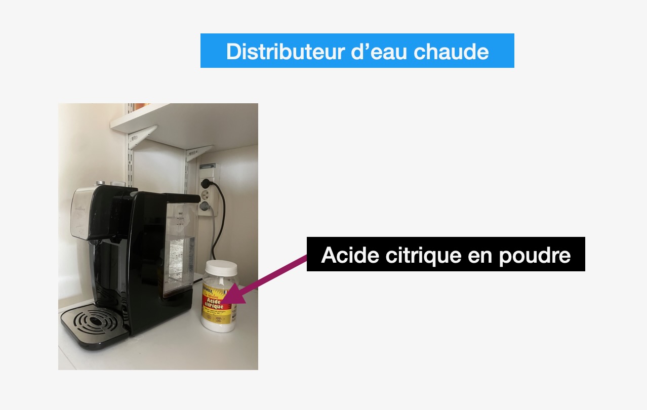 Pour détartrer votre distributeur d’eau chaude, utilisez de l’acide citrique en poudre. C’est la solution la plus simple, la plus économique et la plus écologique.