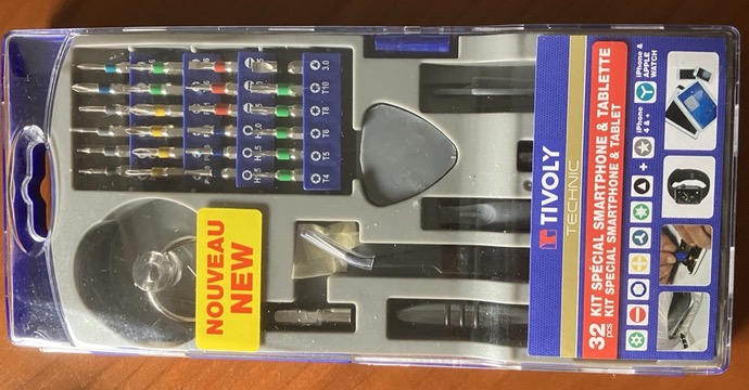 Nous avons commandé la batterie avec la plus grande capacité sur AMAZON et acheté le « Kit spécial smartphone et tablette » pour retirer les vis du panneau arrière et obtenir le spudger recommandé pour le démontage. En suivant les instructions, nous avons remplacé la batterie sans problème.